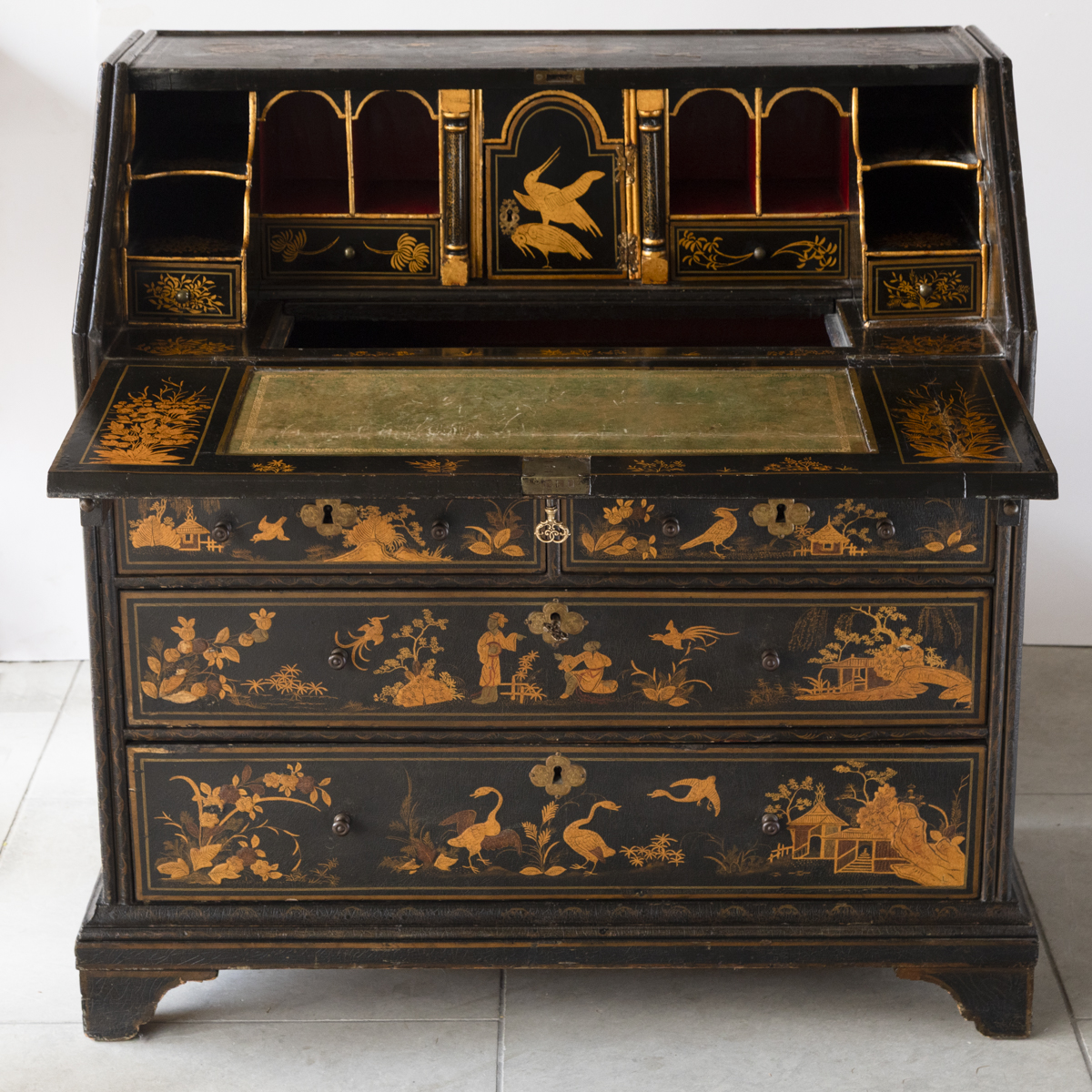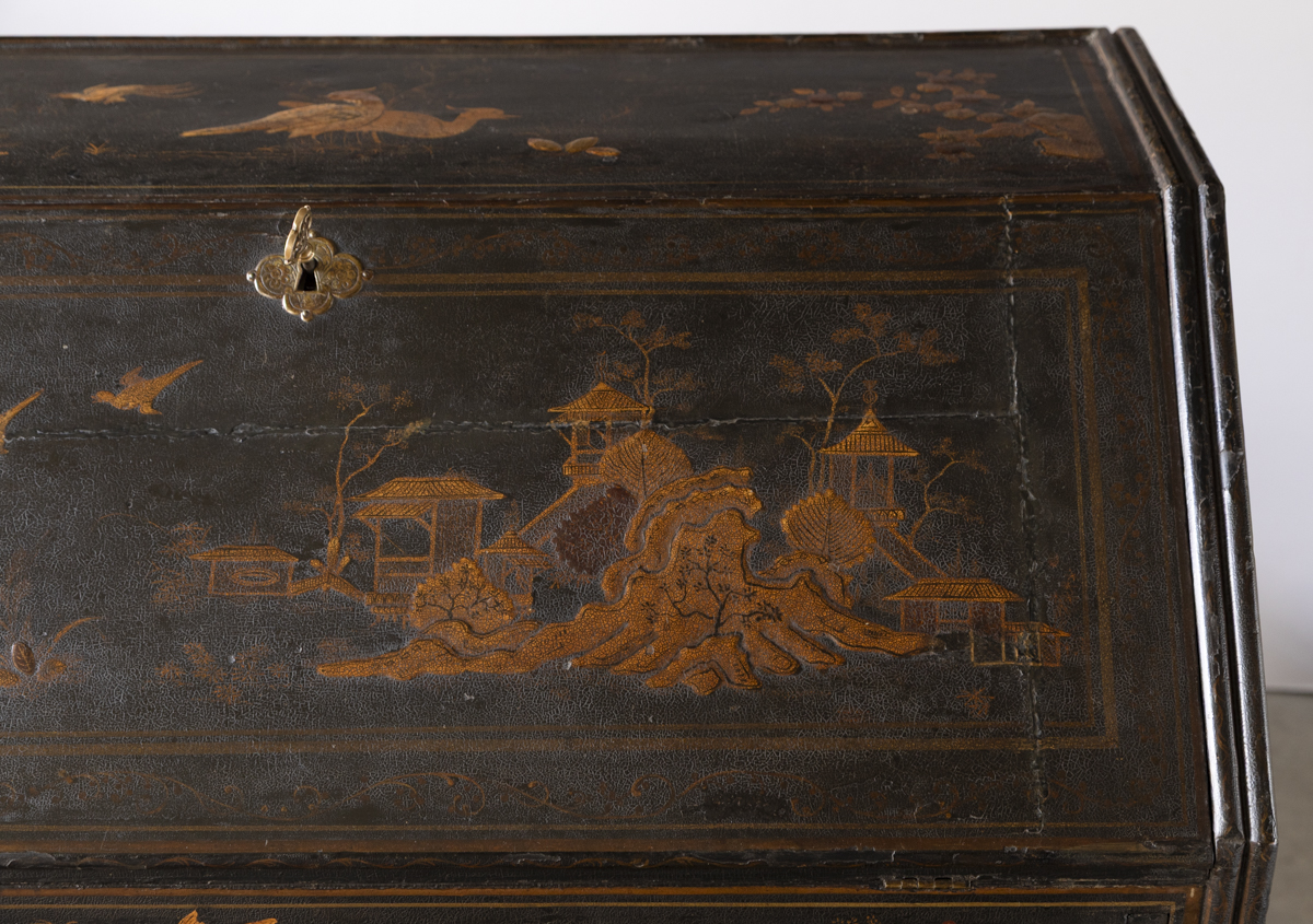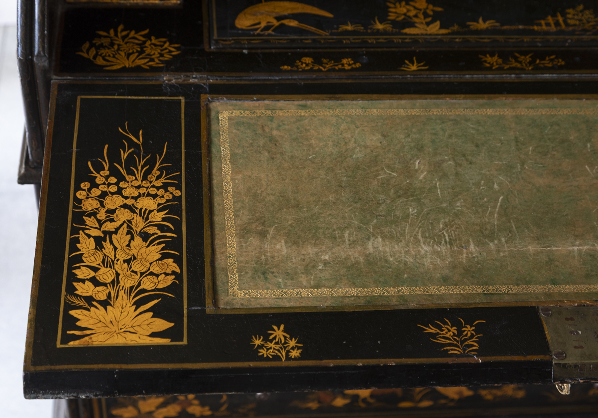 Decorated in gold against a black ground with scenes on all sides imitating 17th century lacquer, depicting birds, figures and gardens in the Japanese style. The fall front enclosing a fitted interior with four variously sized drawers, eight pigeon holes with a central cupboard, two secret drawers and a sliding well. Green leather writing top with gold tooled edge.