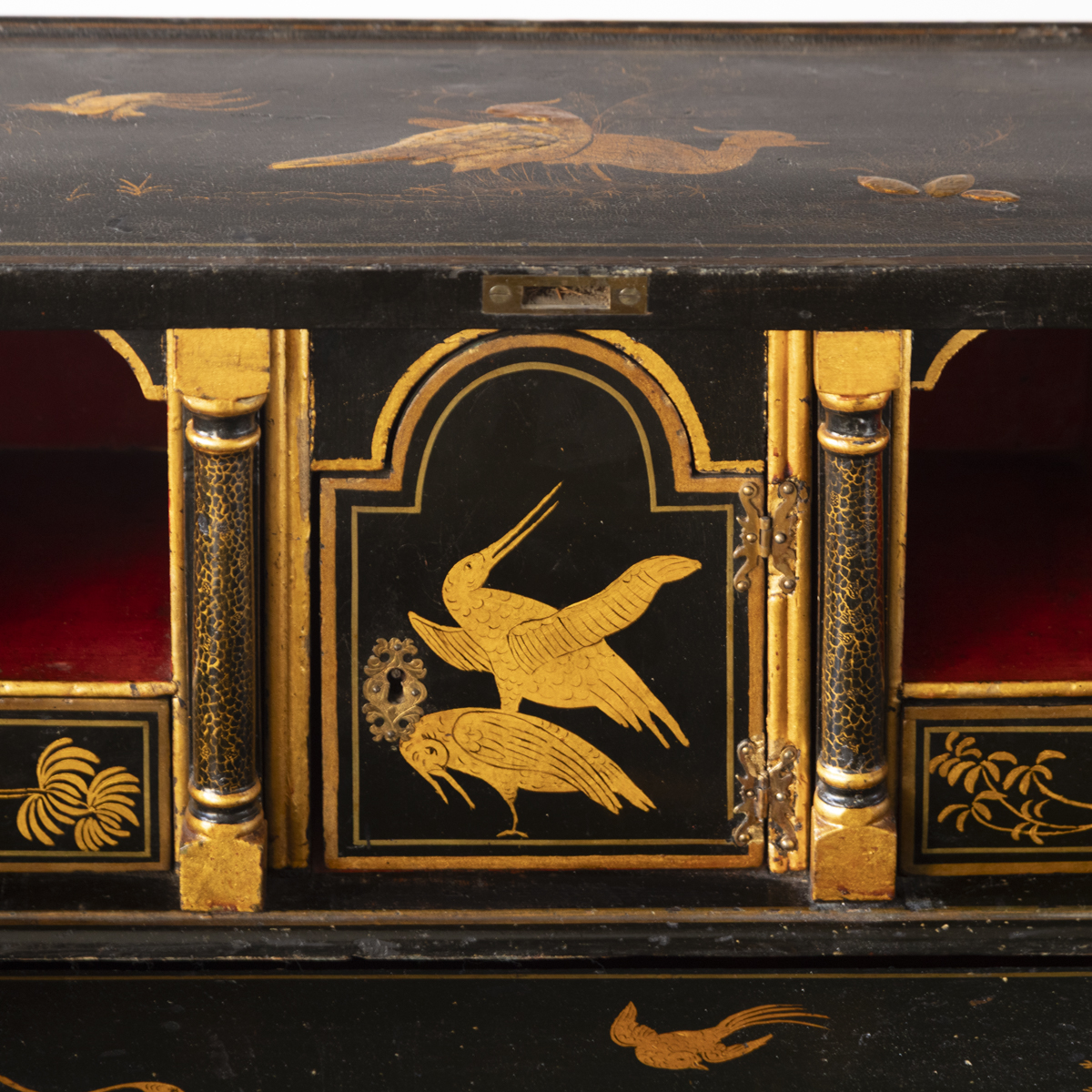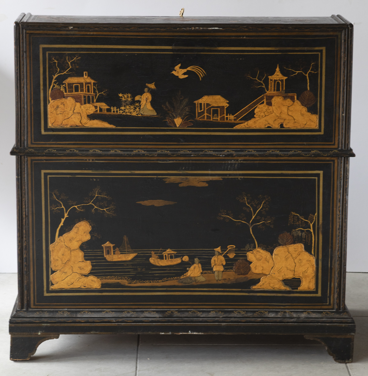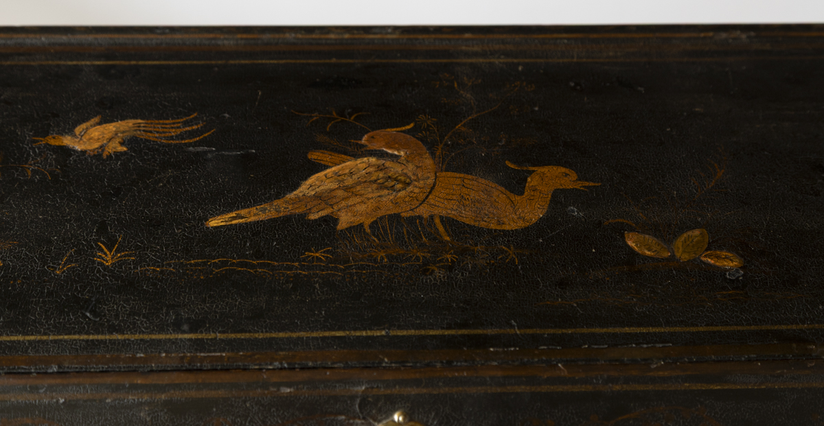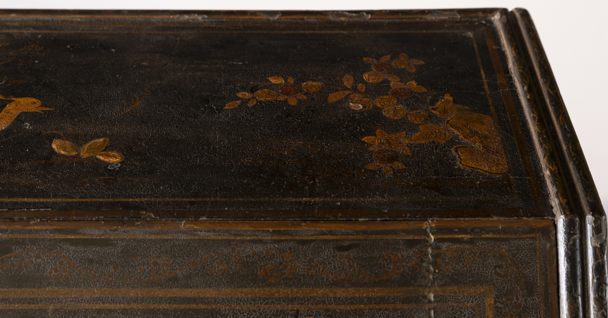 Decorated in gold against a black ground with scenes on all sides imitating 17th century lacquer, depicting birds, figures and gardens in the Japanese style. The fall front enclosing a fitted interior with four variously sized drawers, eight pigeon holes with a central cupboard, two secret drawers and a sliding well. Green leather writing top with gold tooled edge.