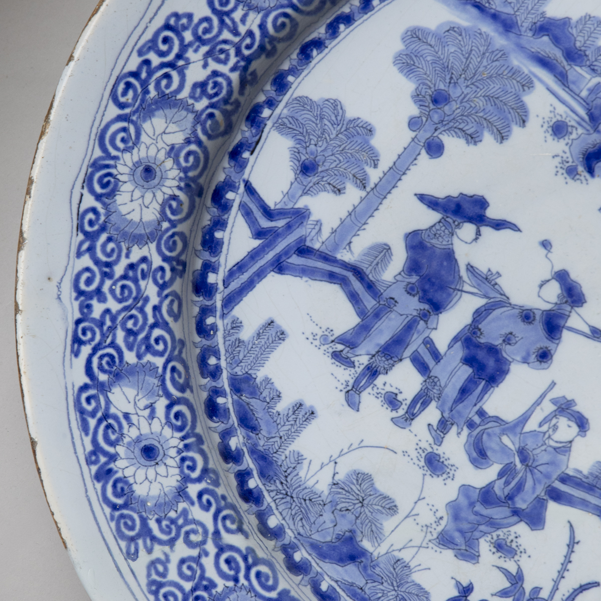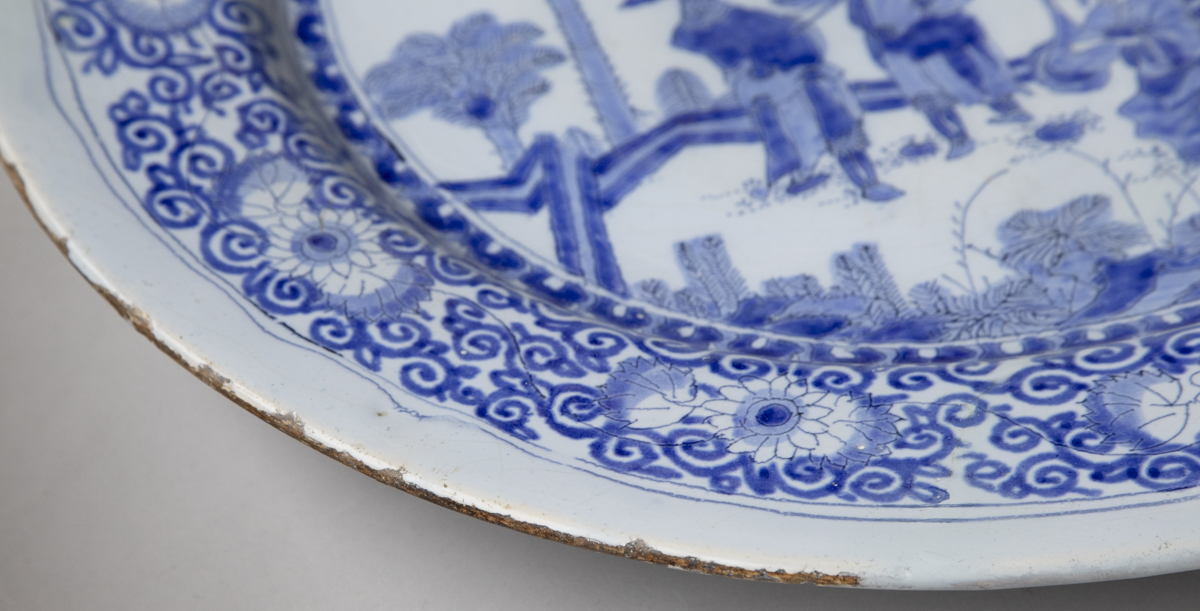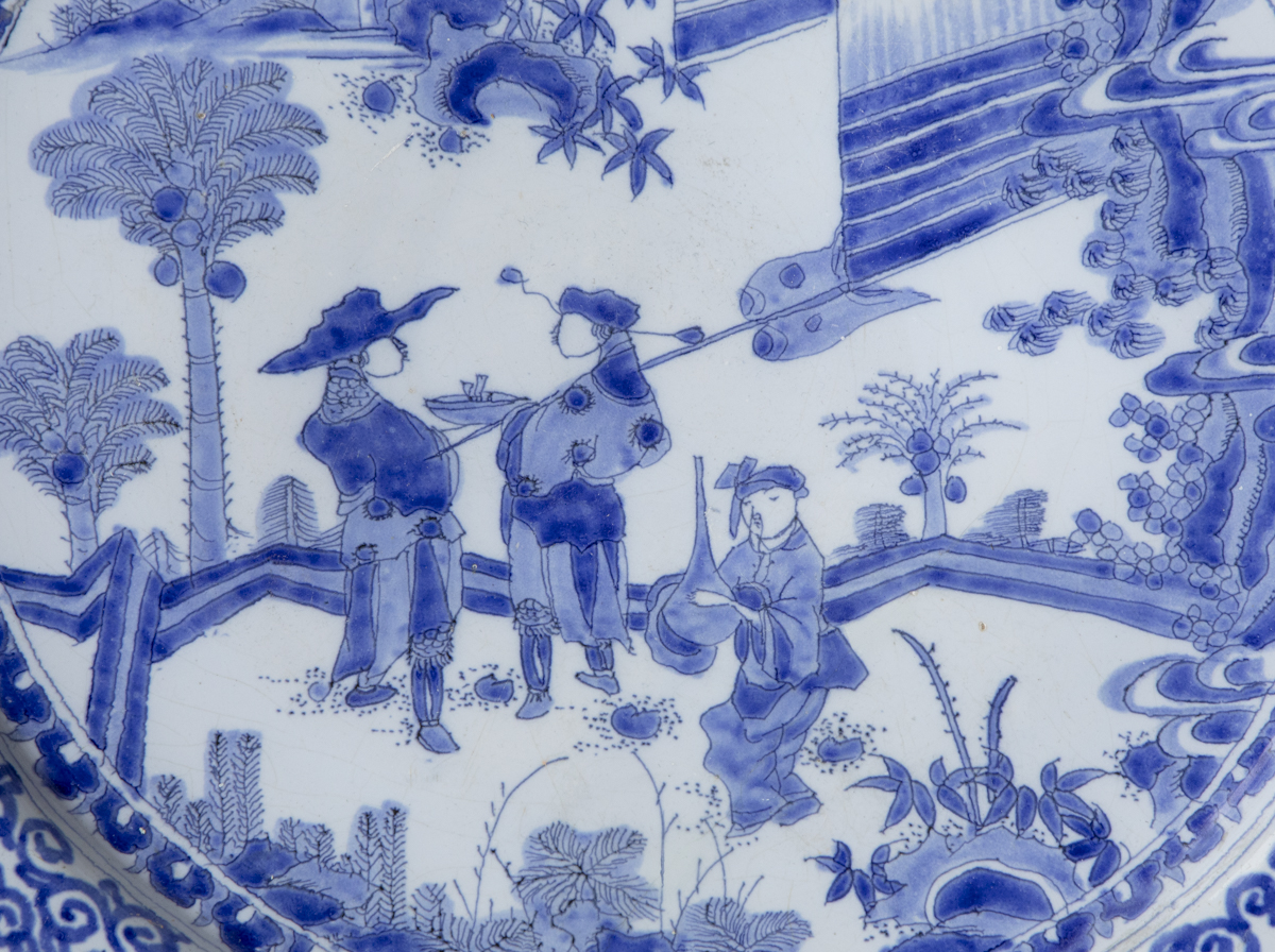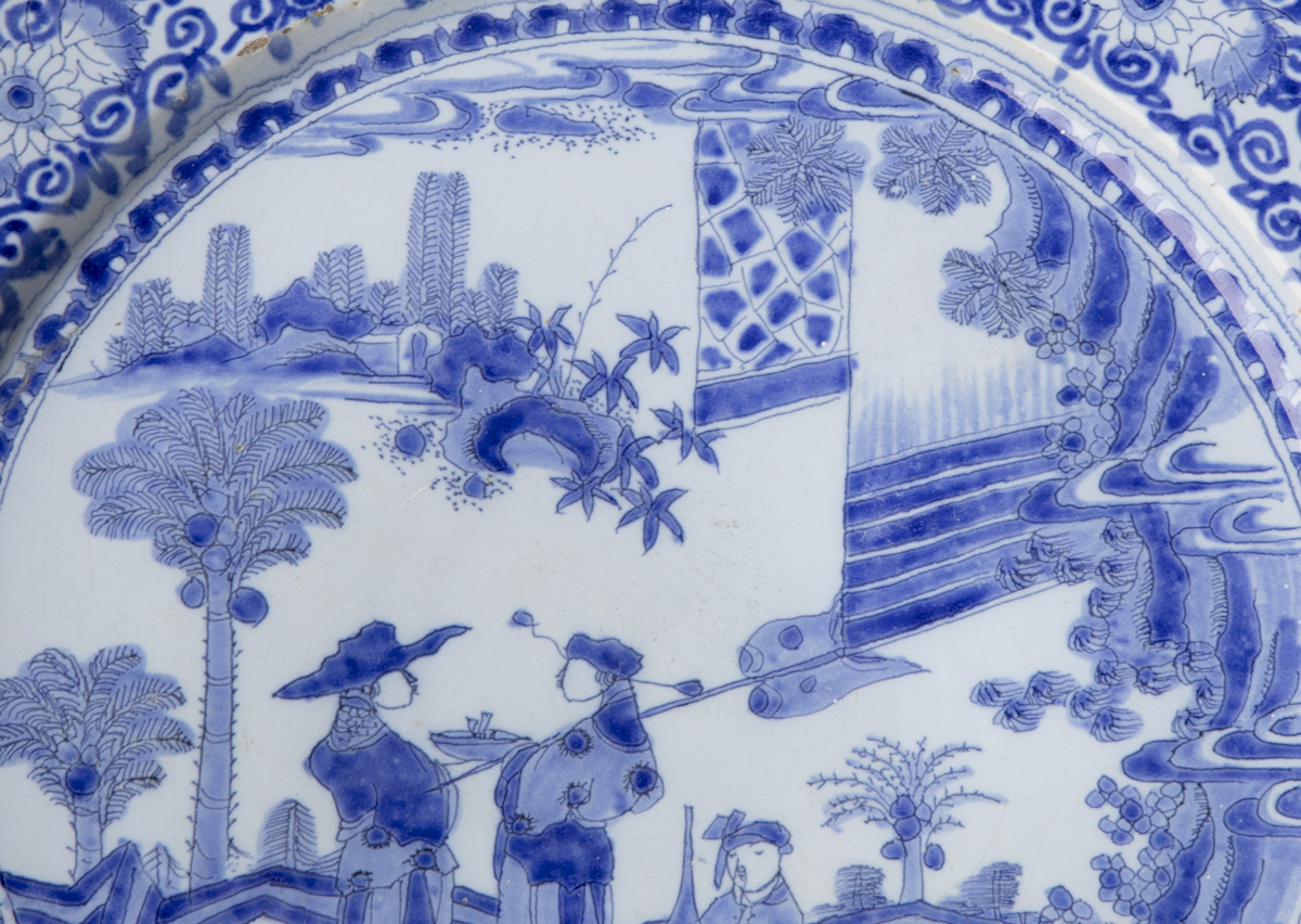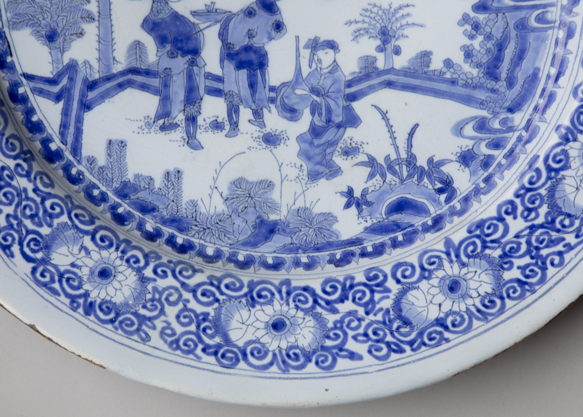 Painted in cobalt blue on a white ground. The centre of the plate with groups of figures in a garden setting painted in the