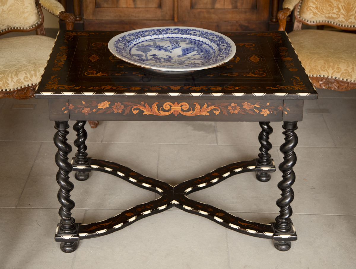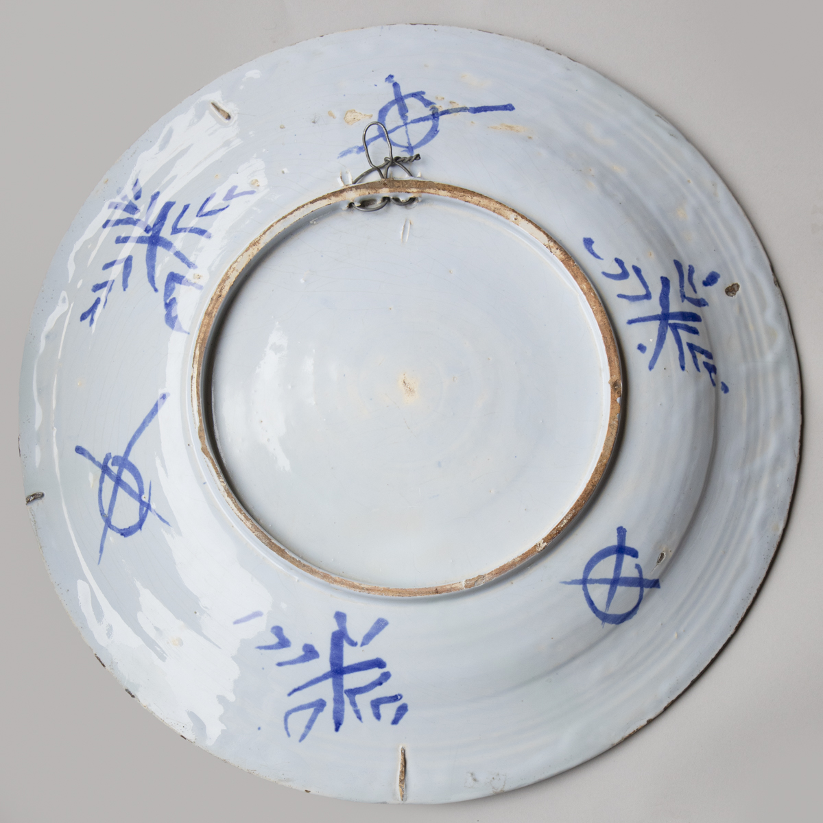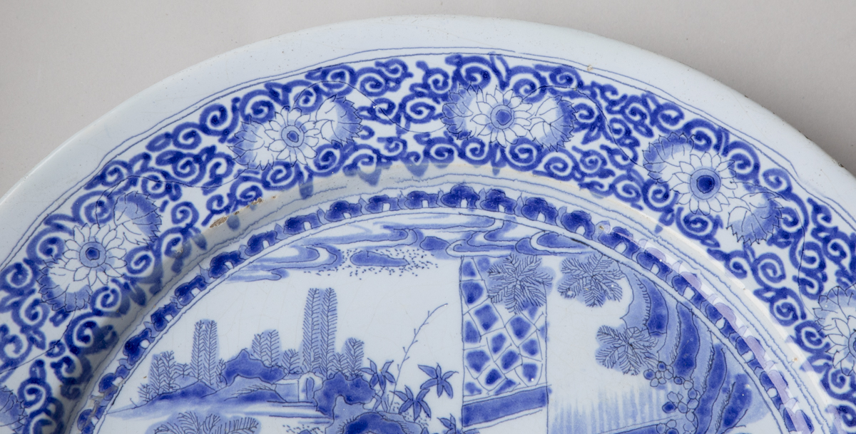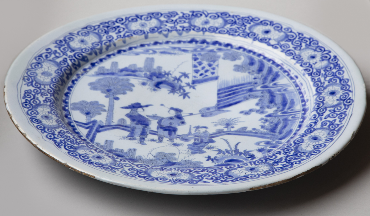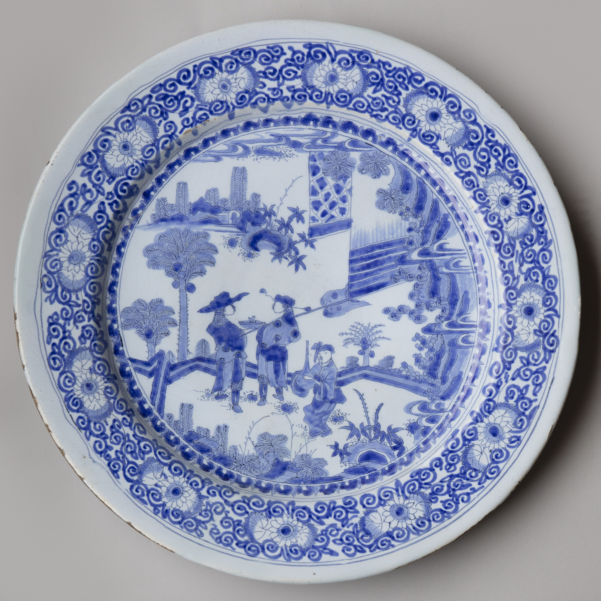 Painted in cobalt blue on a white ground. The centre of the plate with groups of figures in a garden setting painted in the