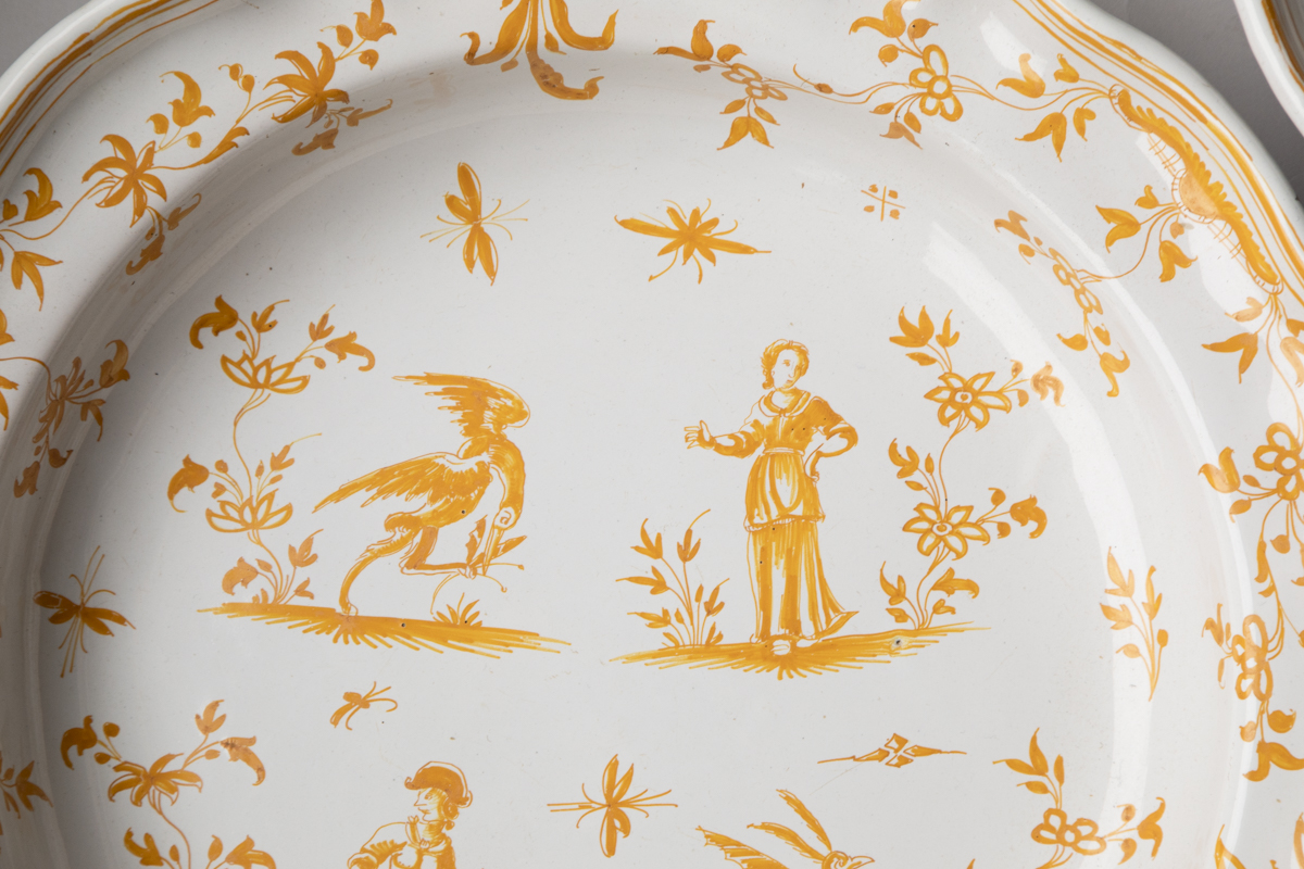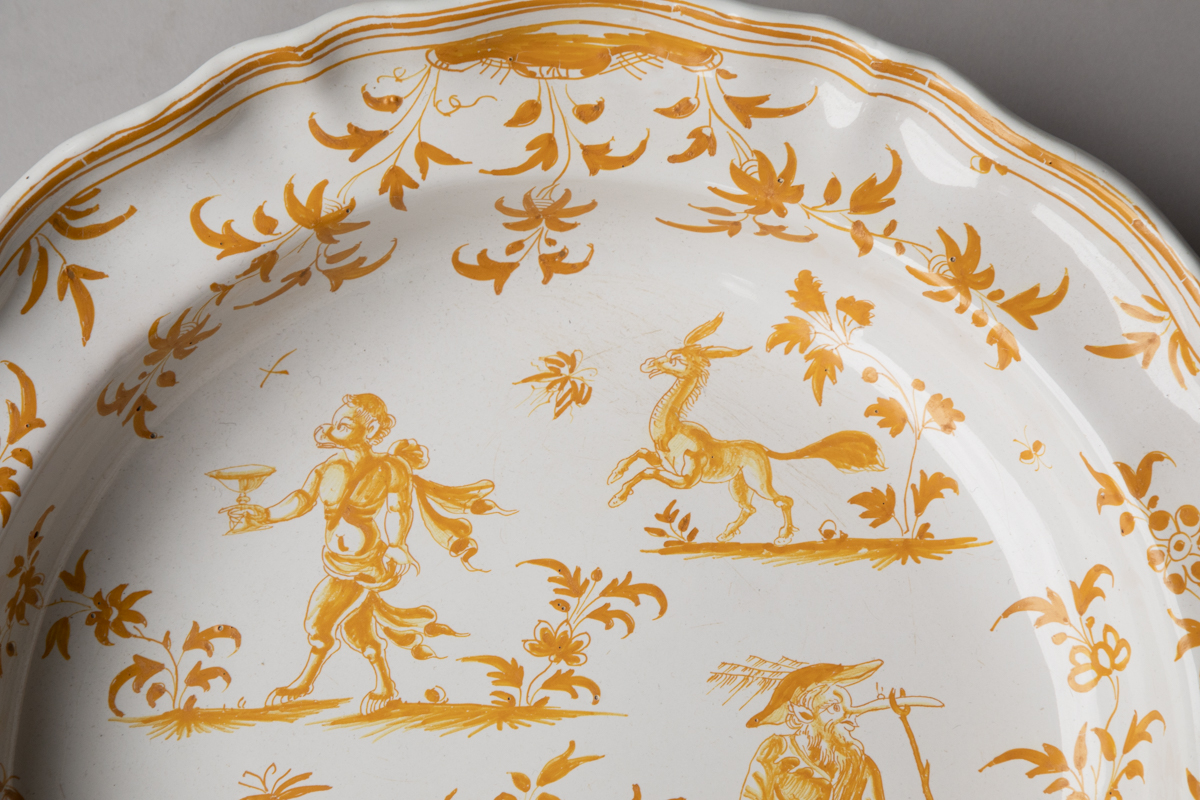 Painted in yellow on a white ground with scenes inspired by the Commedia dell'Arte depicting mythical beasts and theatrical caricatures. Plants and flowers surround them and the whole encircled by yellow lines around the edge.