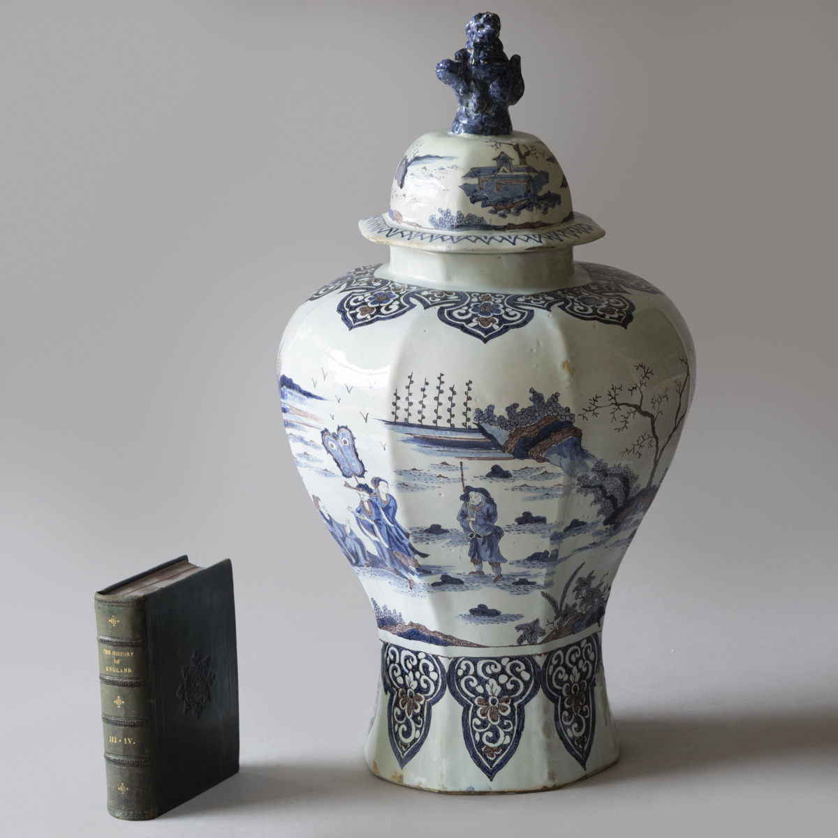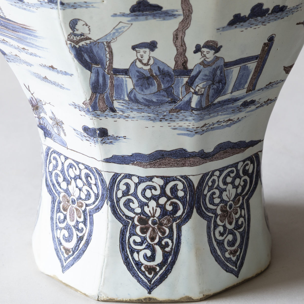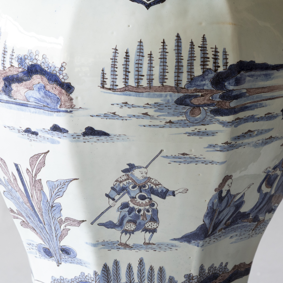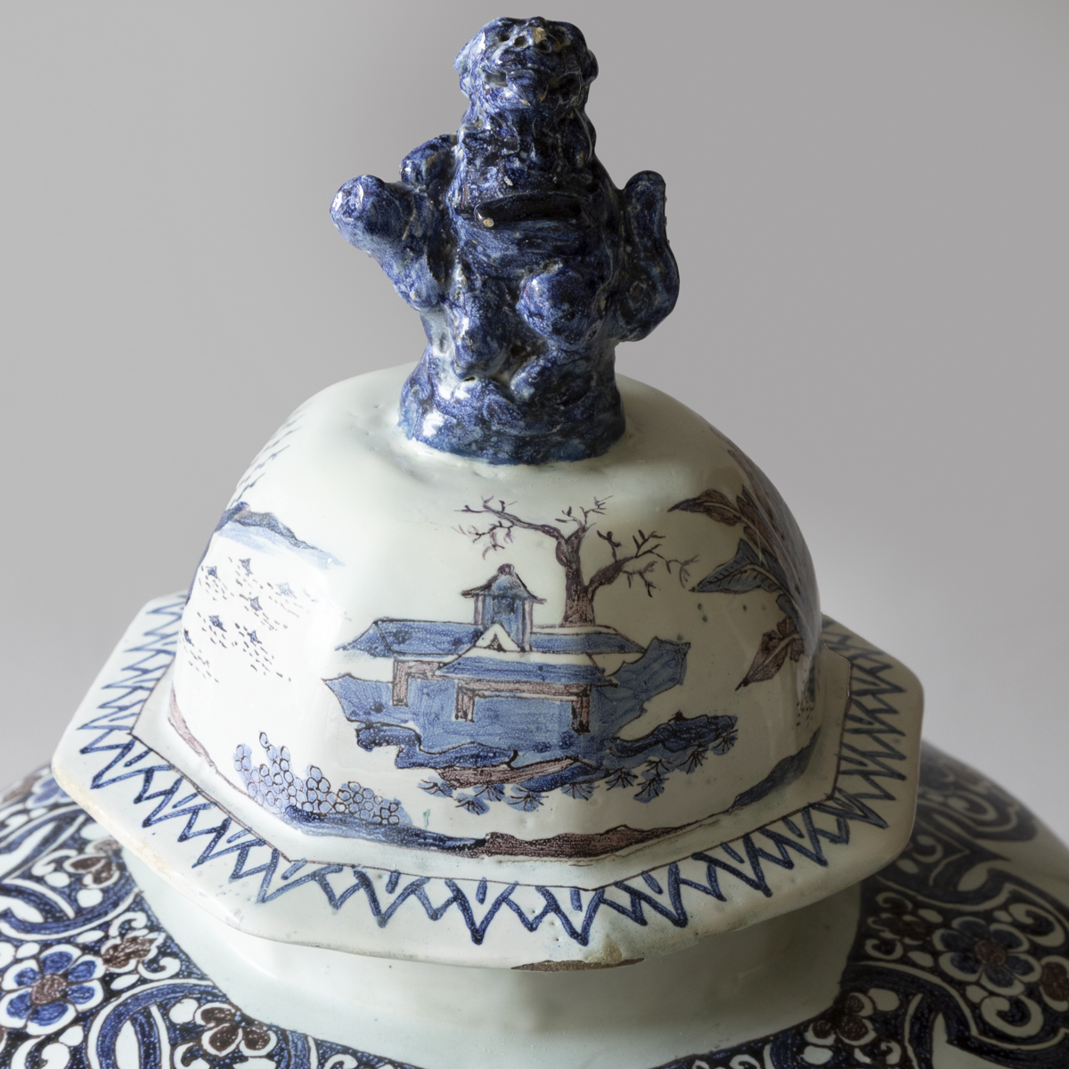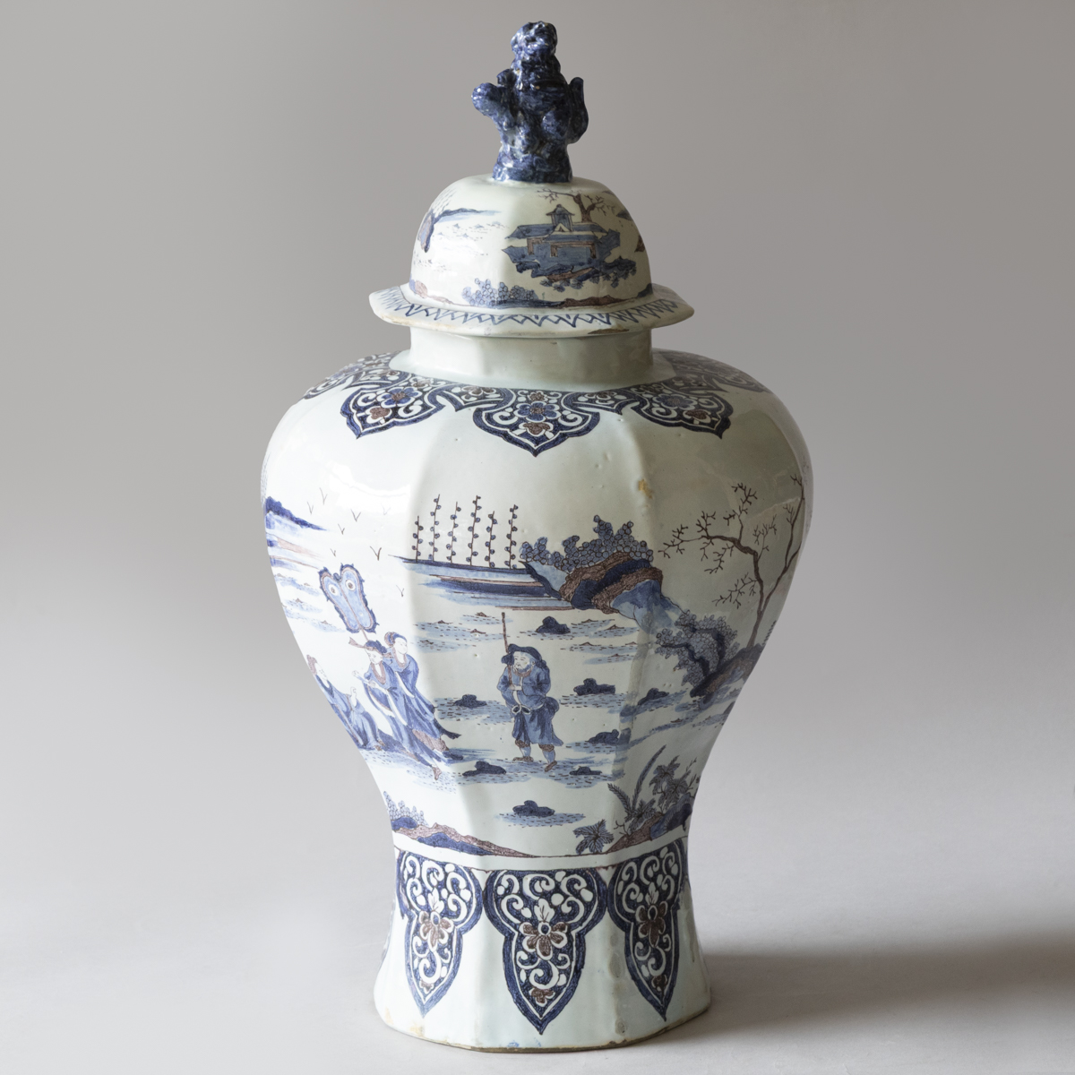 An 18th century baluster lidded vases with eight sides in blue and manganese on a white ground. Decorated with chinoiserie scenes of groups of people dressed formally in a garden setting. With lambrequins around the neck and the base. The lid with a upright dog finial and more pastoral scenes.