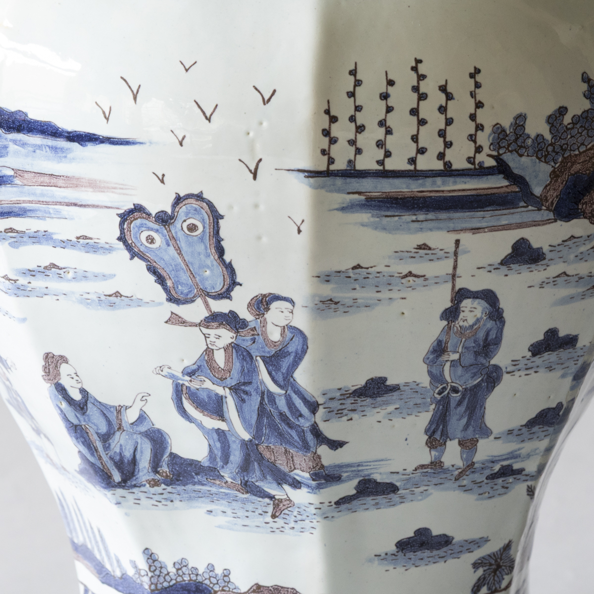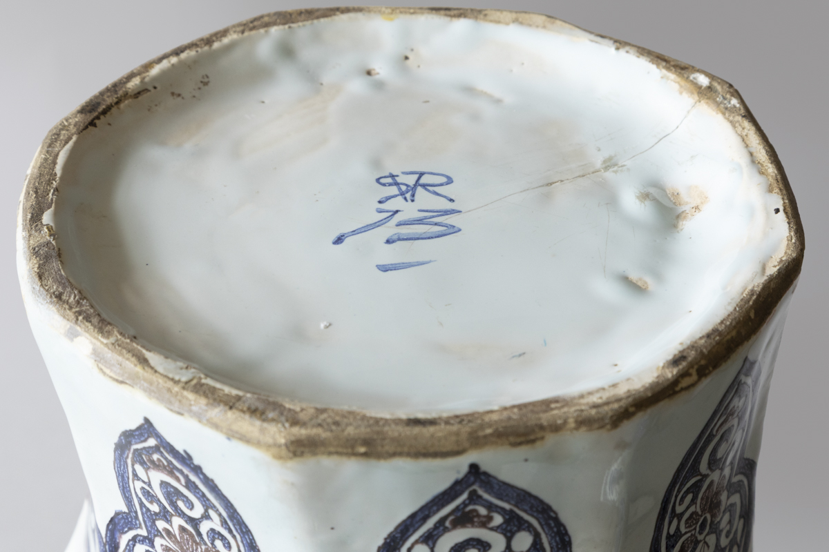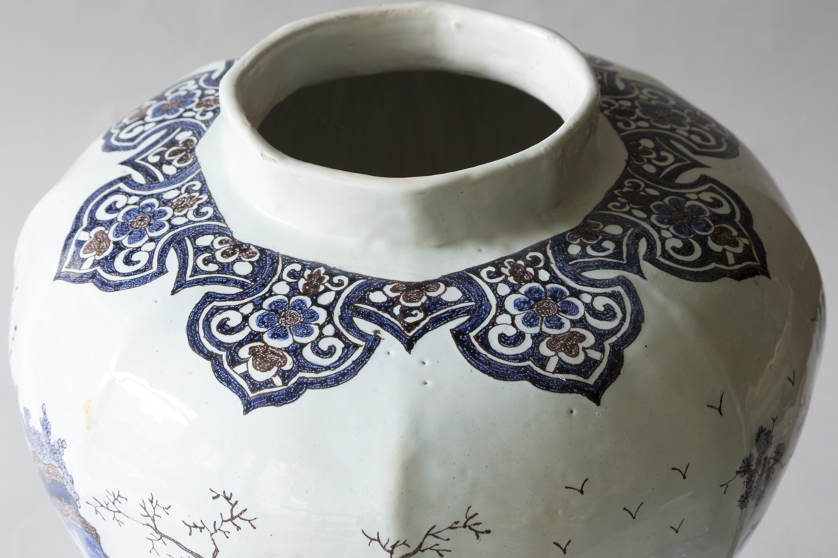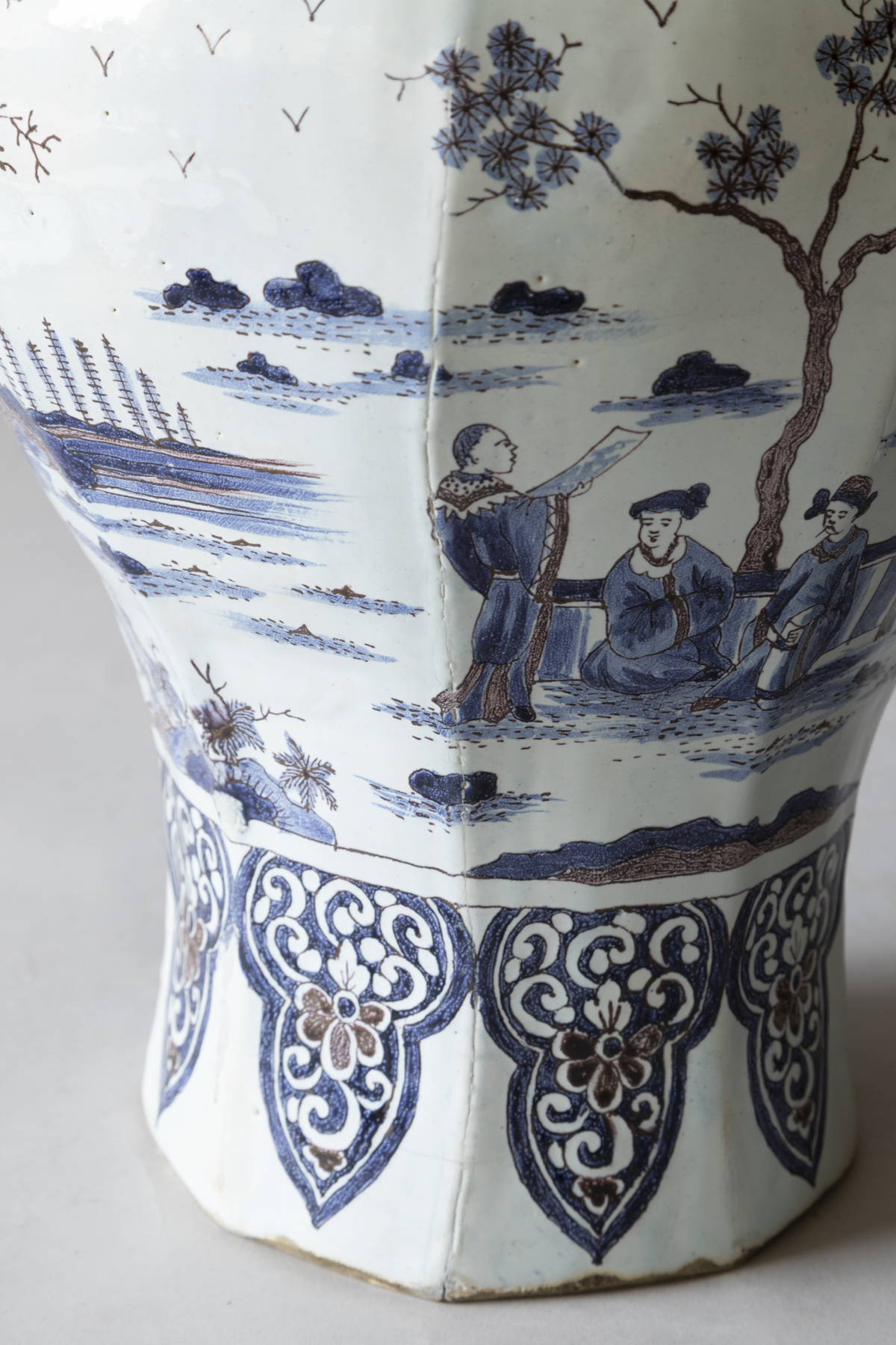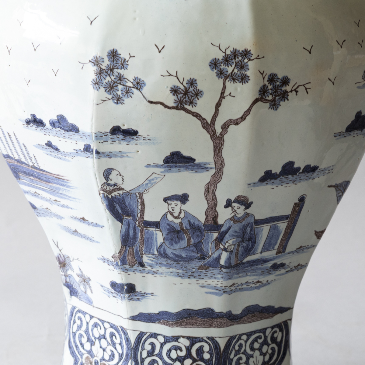 An 18th century baluster lidded vases with eight sides in blue and manganese on a white ground. Decorated with chinoiserie scenes of groups of people dressed formally in a garden setting. With lambrequins around the neck and the base. The lid with a upright dog finial and more pastoral scenes.