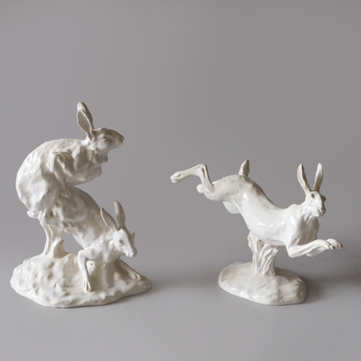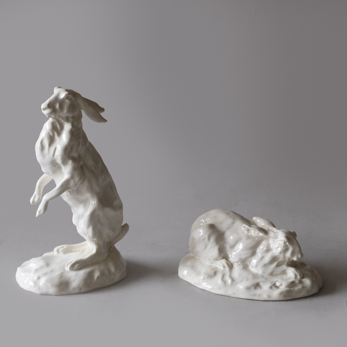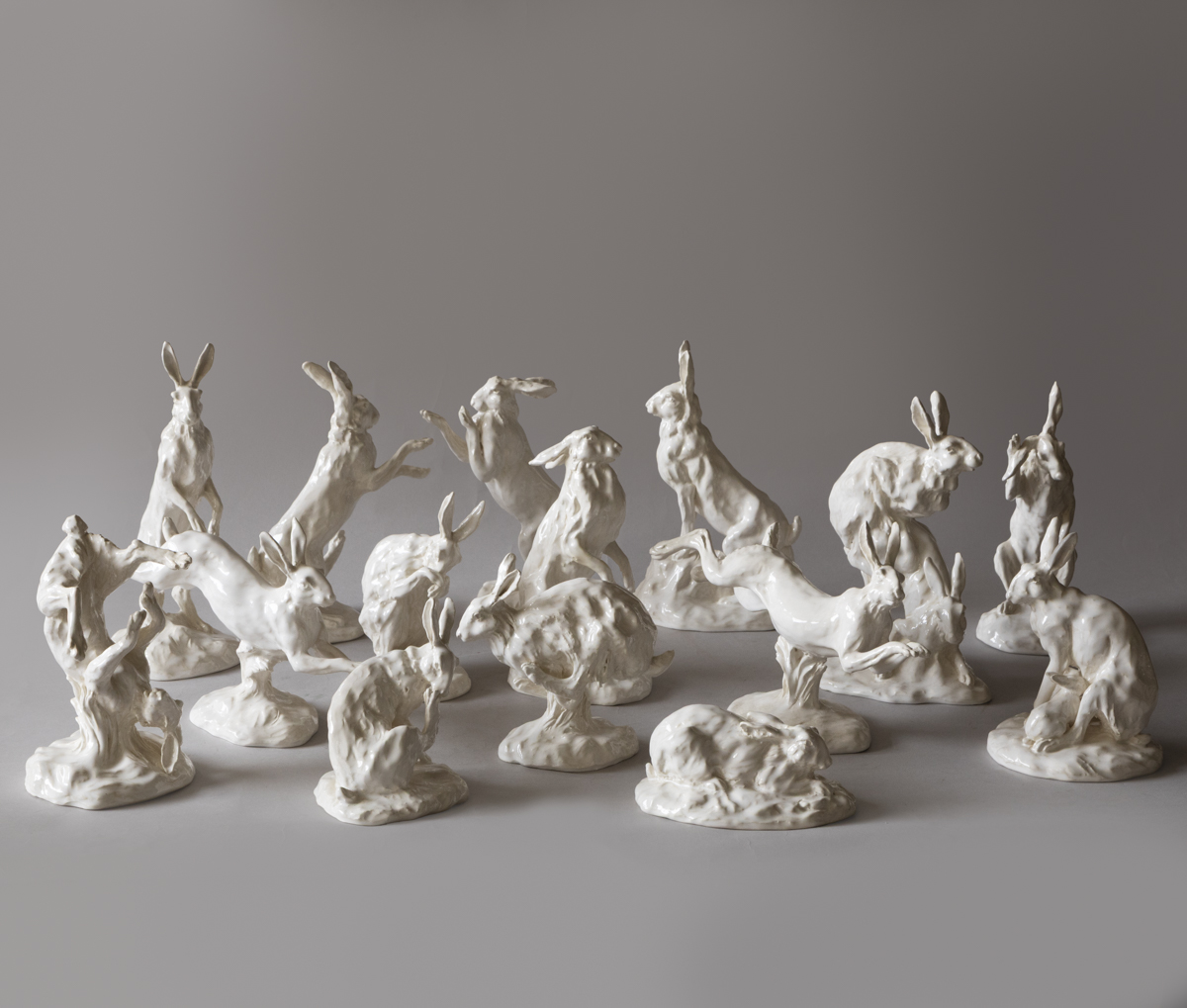 A collection of fifteen sculptures depicting hares in various lifelike positions; standing, sleeping, boxing etc.