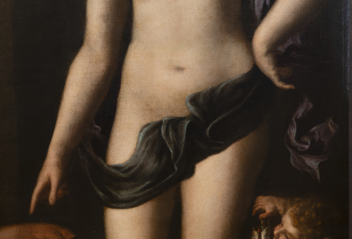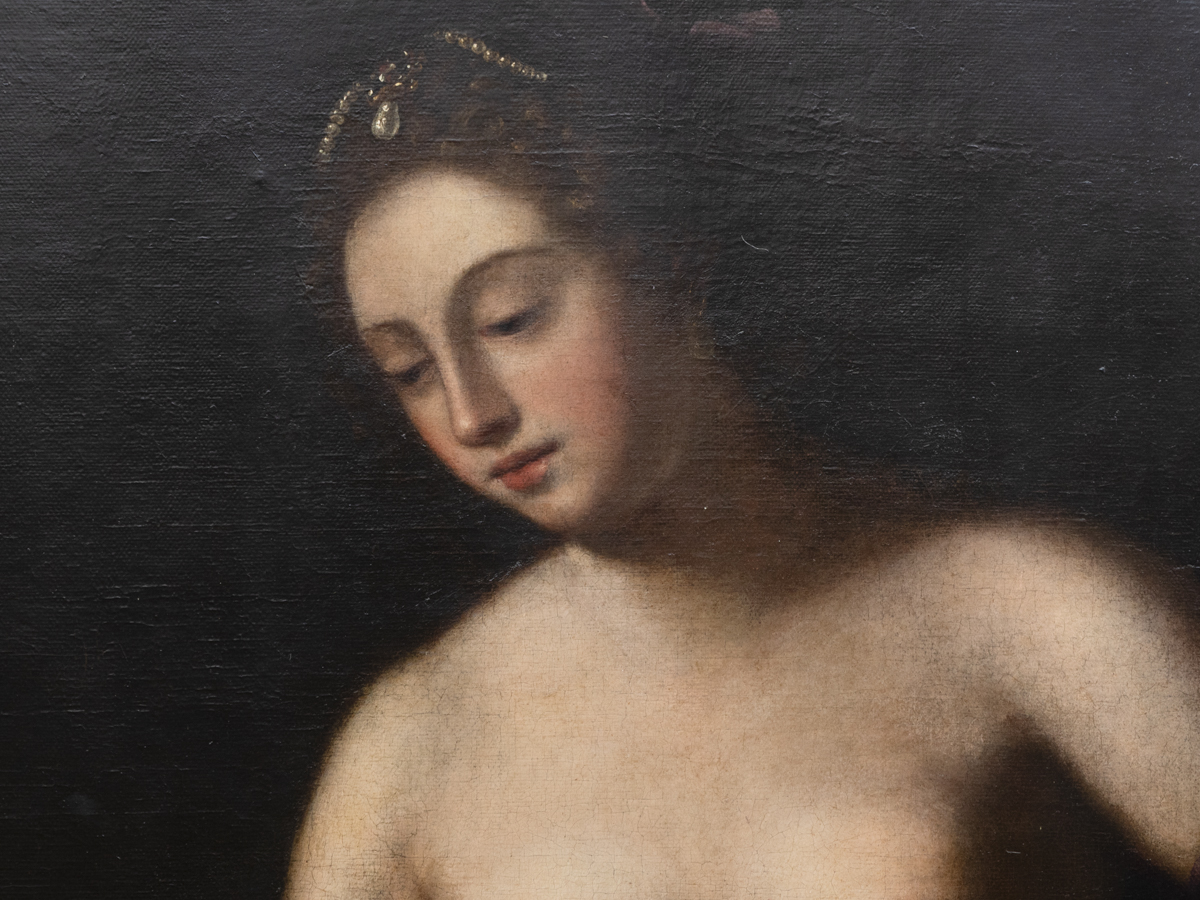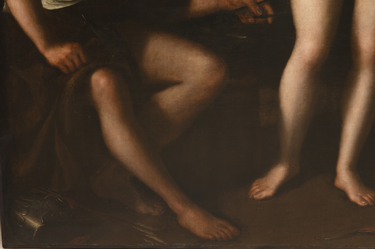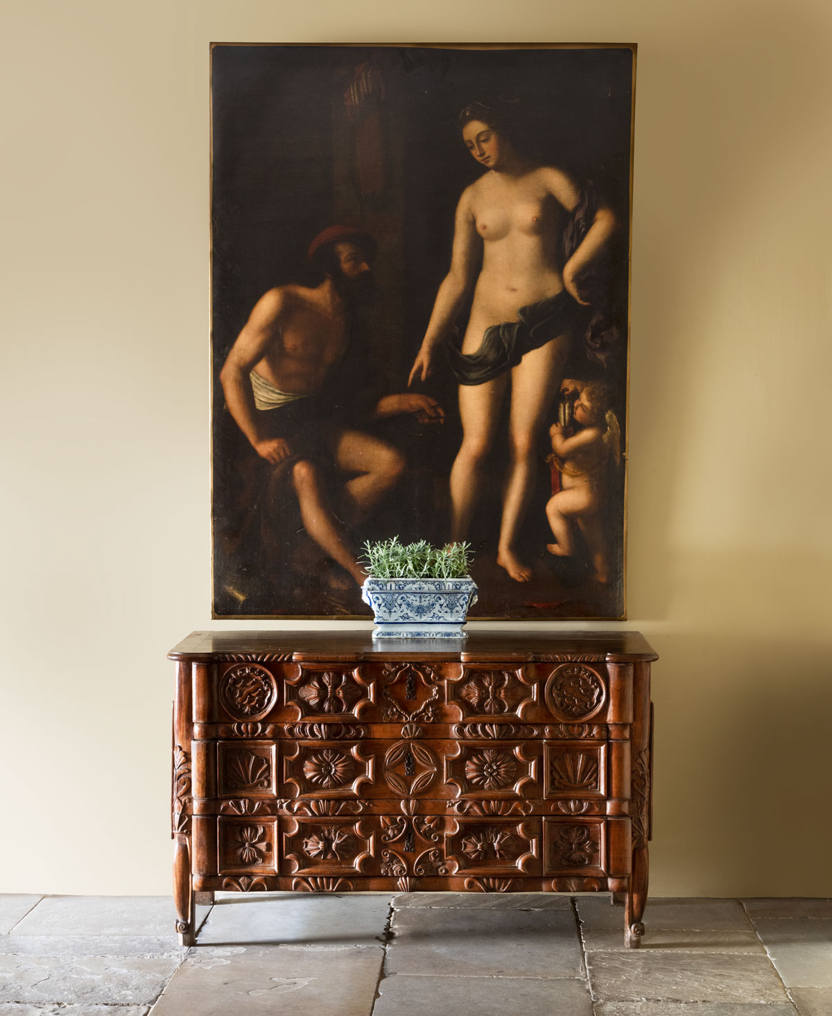 blacksmith to the gods, with Venus' son Cupid holding a quiver full of arrows with a bow on the ground in front of him. Vulcan holds a hammer and tongs, the tools of his trade with armour at his feet, possibly meant for Venus' mortal son Aeneas to fight with in the wars against the Rutuli, written of in Virgil's epic poem the Aeneid.