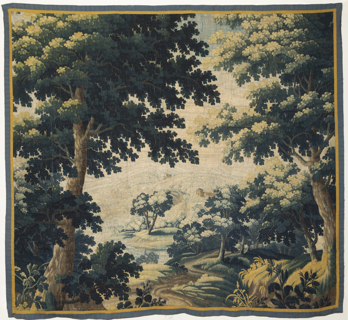Fine quality wool and silk verdure with trees and plants. A path winds through the trees from the centre to a body of water in the middle where trees are reflected.