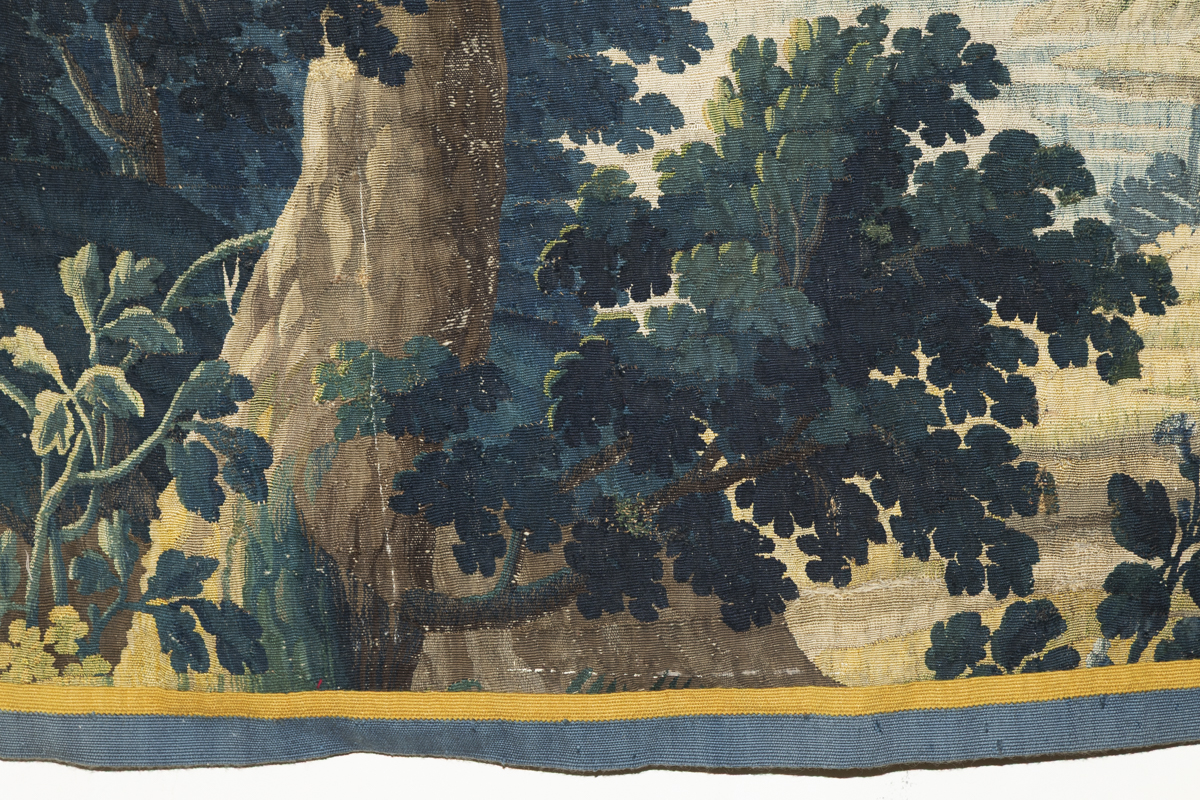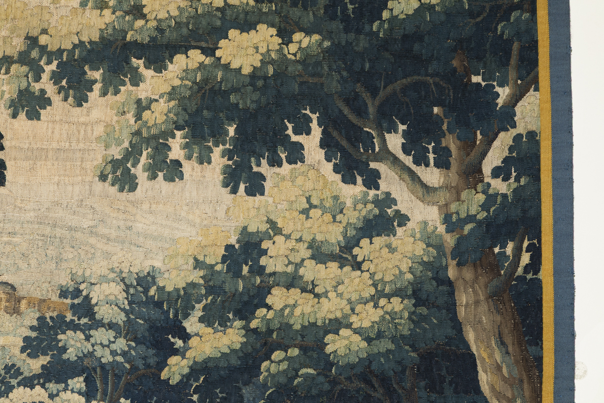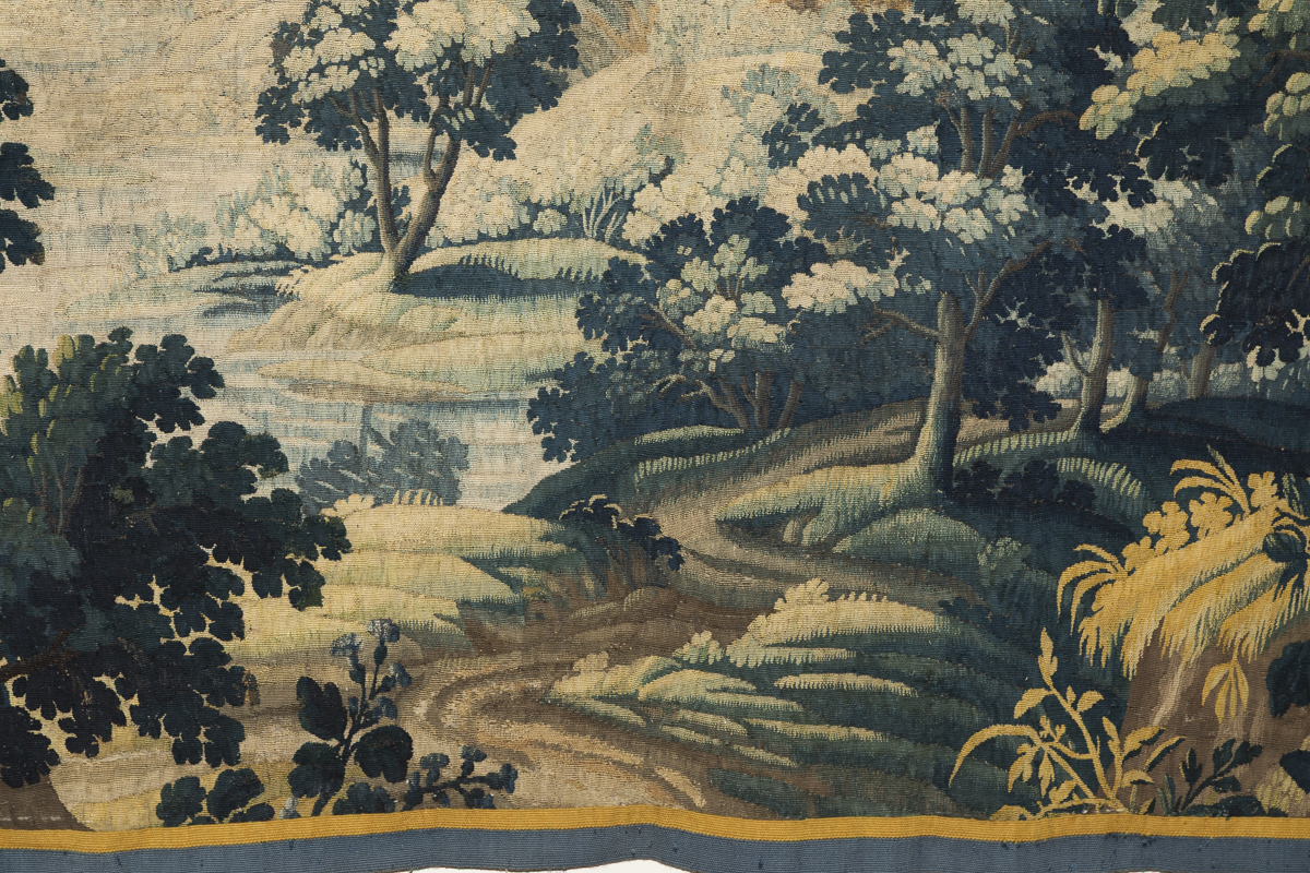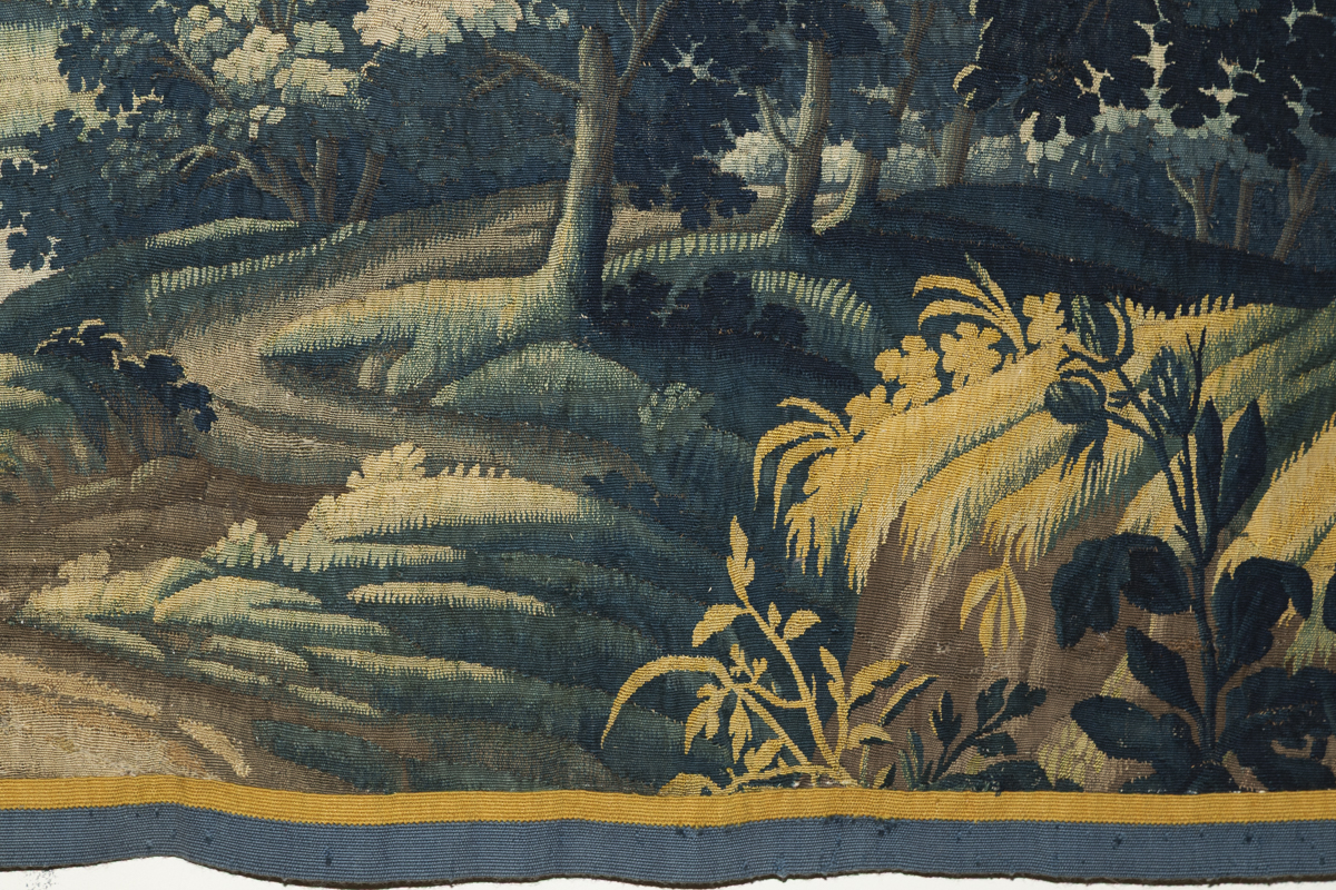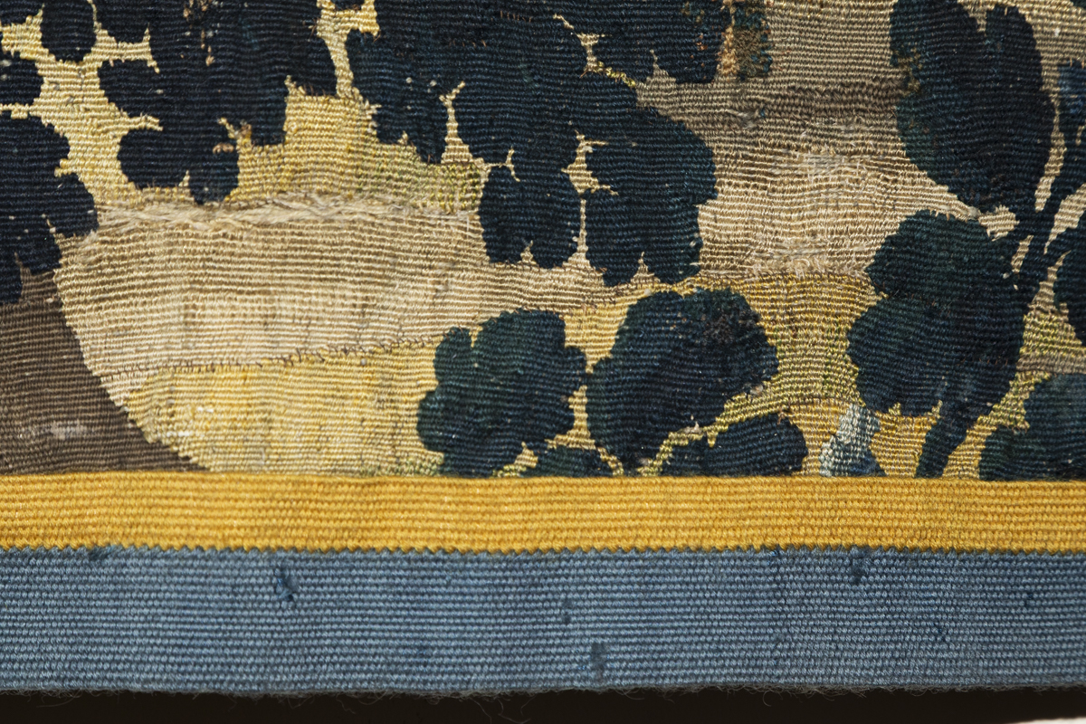 The tapestry is backed with linen and in good condition, the blue and yellow border is a later replacement.