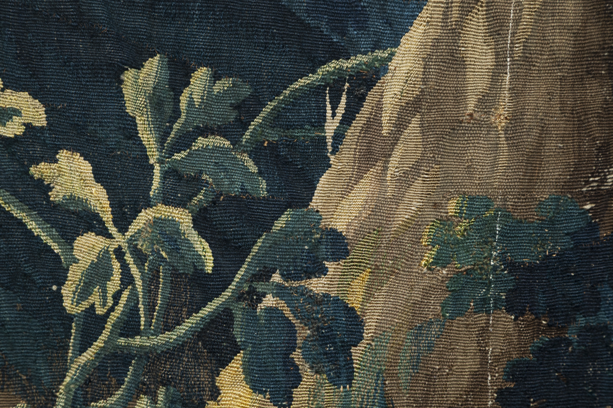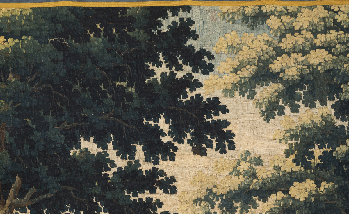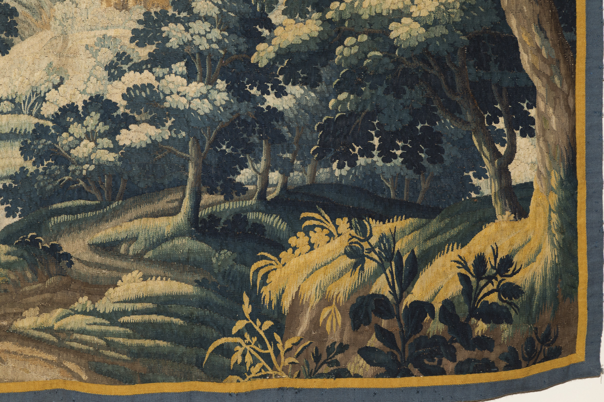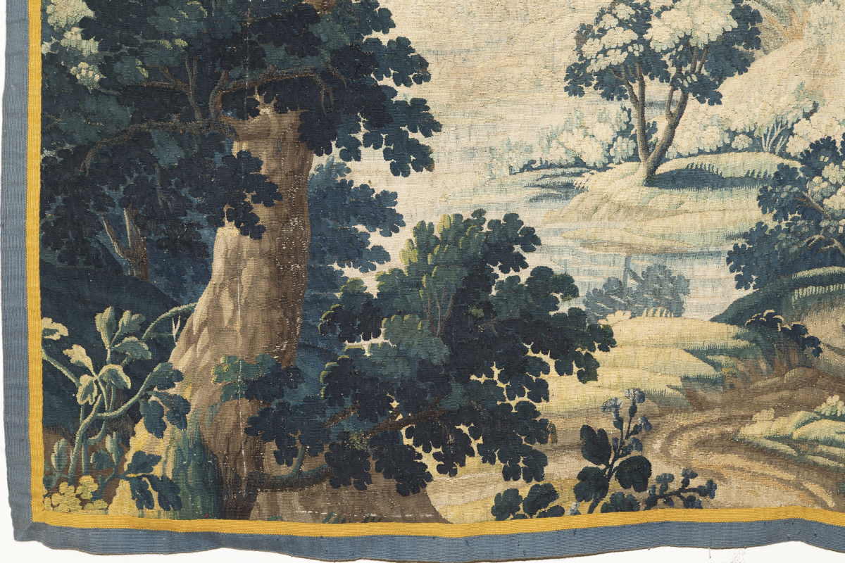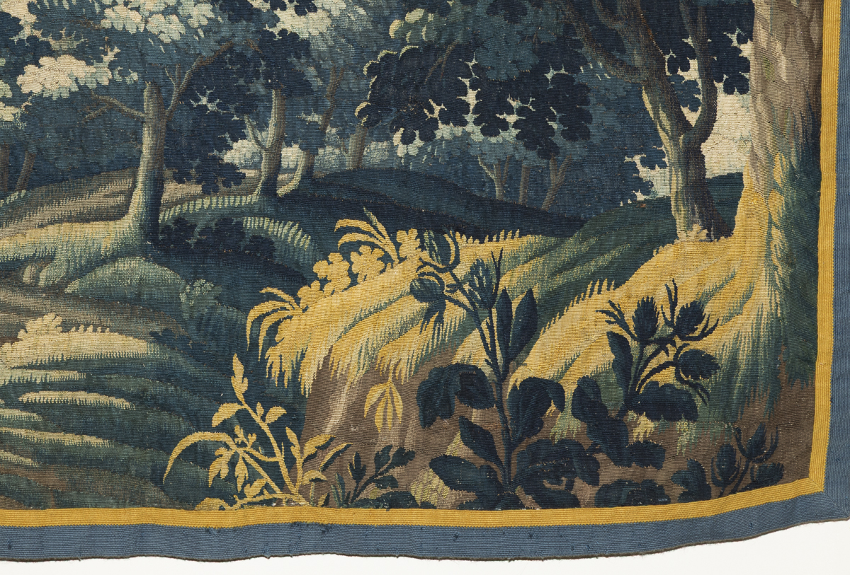 The tapestry is backed with linen and in good condition, the blue and yellow border is a later replacement.