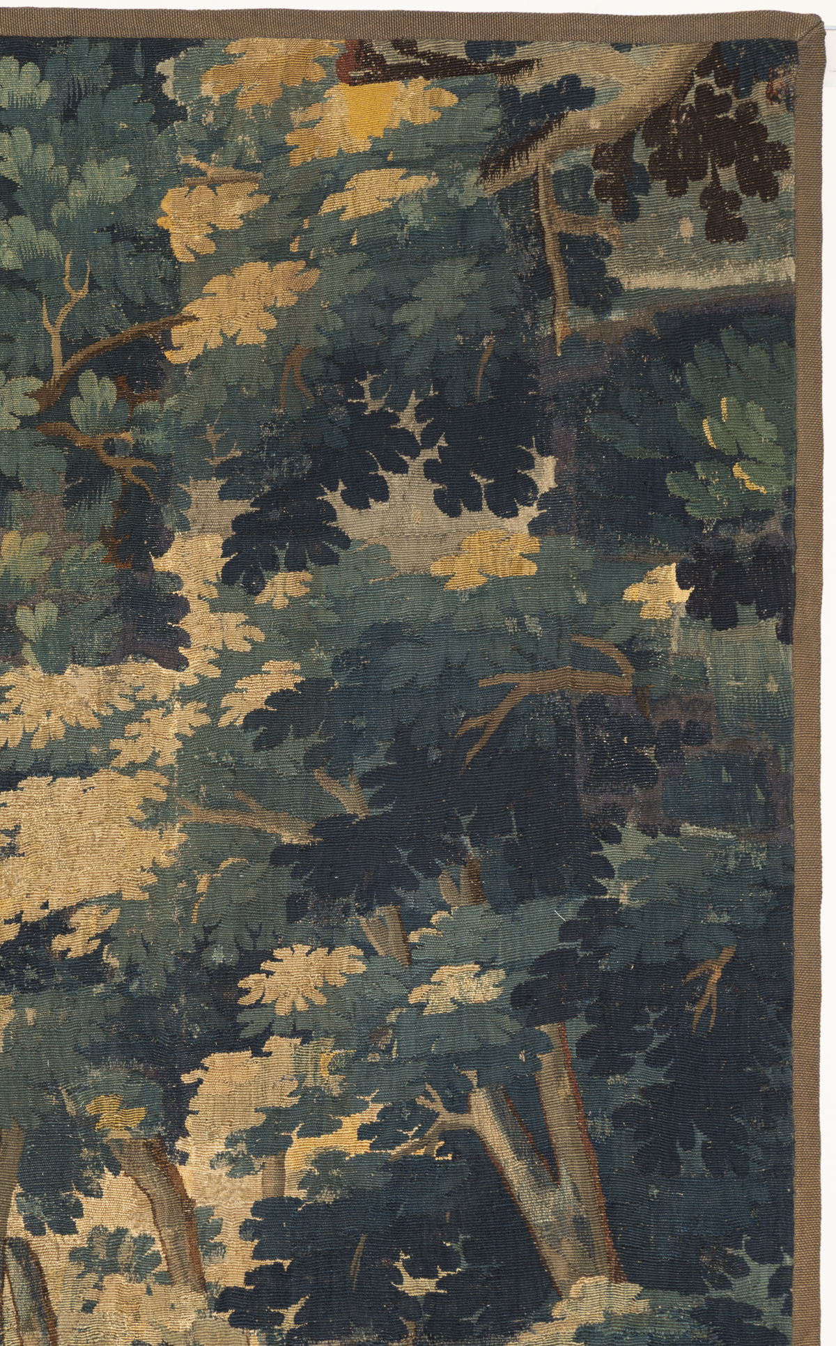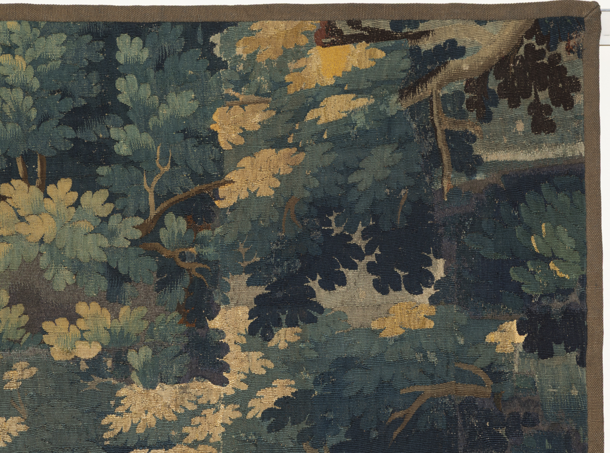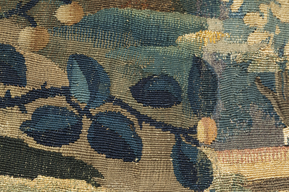 The tapestry is a fragment and has had some patching, visible in the photographs.